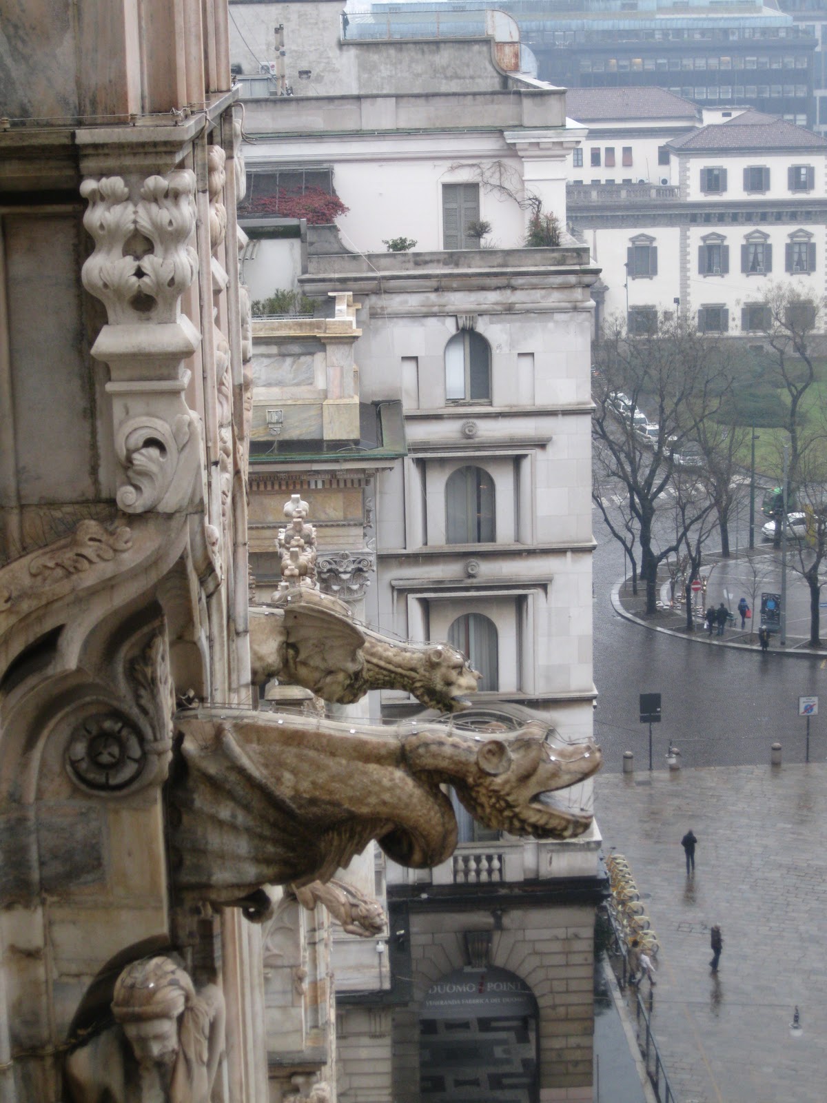 I spent a magical day in the city of Milano, Sunday. The weather was dreary, but my spirits were soaring when I emerged from the Metro to find the Duomo right in front of me. I immediatly headed over to see how I could get to the top. Of course, the inside is magnificent and somber. The stained glass was very intricate and the the entire place was ornate. I spent time walking around and standing in architectural awe!